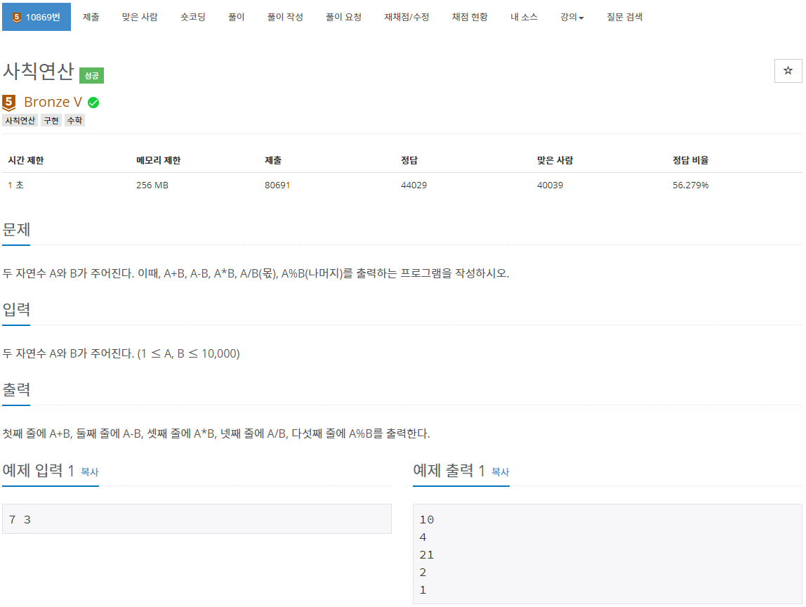첫째 줄에 A+B, 둘째 줄에 A-B, 셋째 줄에 A*B, 넷째 줄에 A/B, 다섯째 줄에 A%B를 출력하는 문제입니다.
