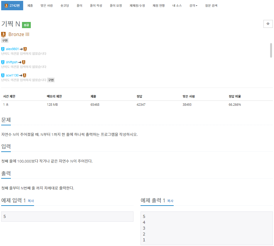 이 포스팅에서는 백준 알고리즘 사이트 2742번을 파이썬으로 코딩해보도록 하겠습니다.