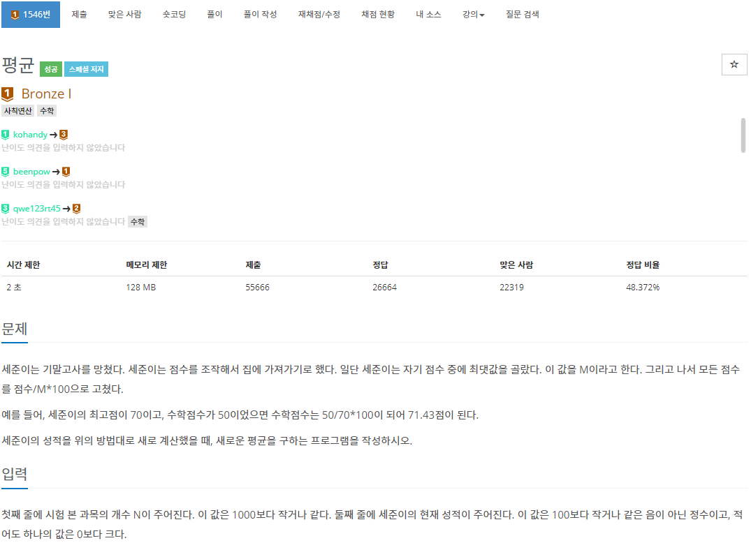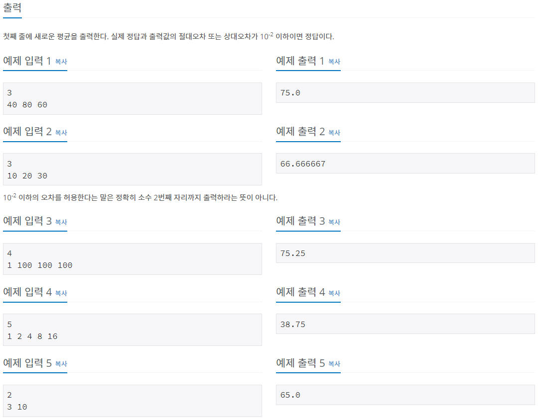 이 문제는 N과 N개의 과목을 입력받아 새로운 평균을 출력하면 되는 문제입니다.