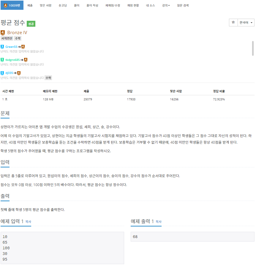 이 문제는 5명의 점수를 입력받은 다음 그것들의 평균 점수를 출력하면 되는 문제입니다.