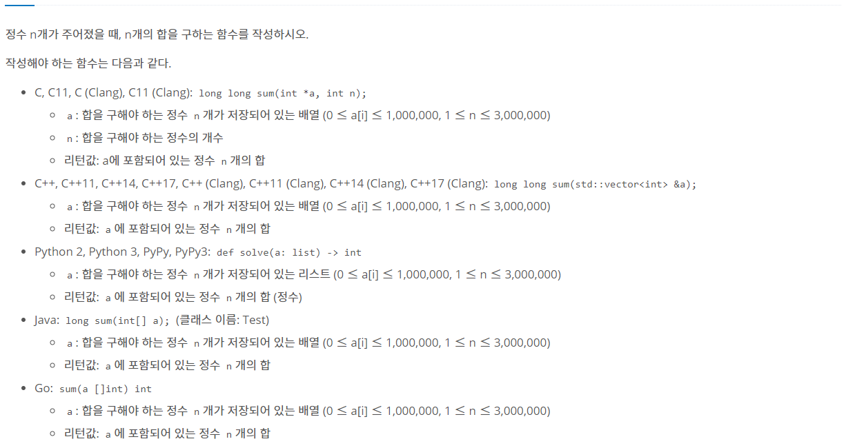 이 문제는 정수 n개가 주어질때 n개의 합을 구하는 함수를 만들면 되는 문제입니다.