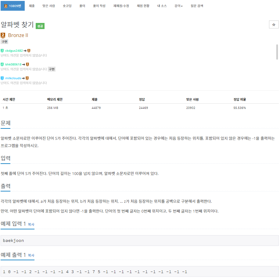 알파벳 순서에 맞게 단어에 알파벳이 존재하면 위치를, 없으면 -1을 출력하면 되는 문제입니다.