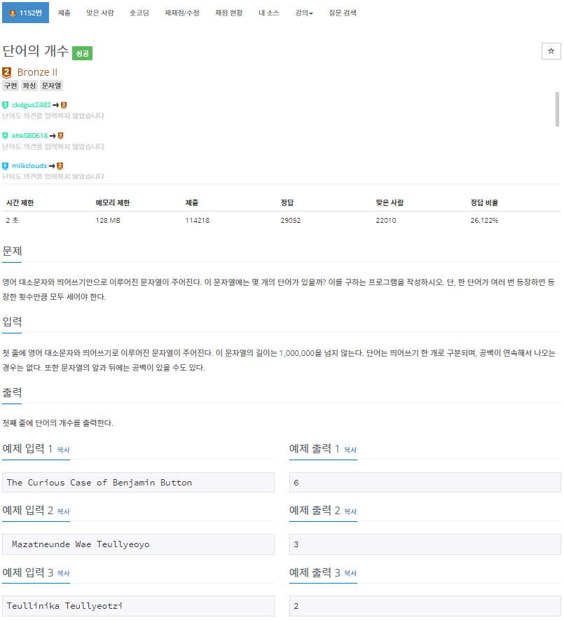 이 문제는 영어 대소문자로 이루어진 문장을 입력받고, 그 문장의 단어의 개수를 출력하면 되는 문제입니다.