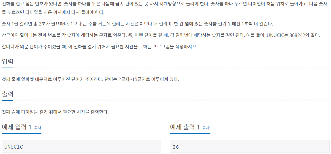 이 문제는 알파벳 대문자로 이루어진 단어를 입력받고, 다이얼을 걸기 위한 시간을 계산해서 출력하면 되는 문제입니다.
