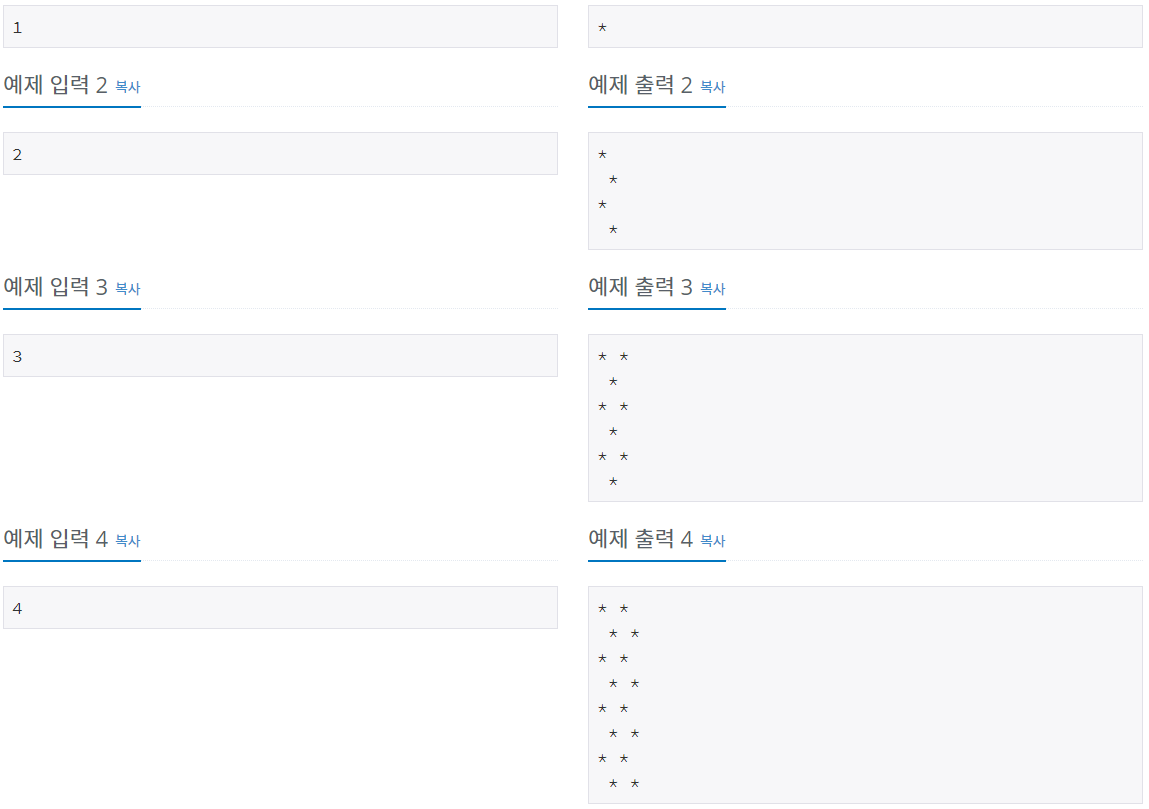 a = int(input())for i in range(1, a*2+1):if a==1:print("*")breakelse:if i % 2 != 0: # 홀수줄 출력for j in range(1, a+1):if j % 2 != 0: # 홀수print("*", end="")else:print(" ", end="")print("")else: # 짝수줄 출력for j in range(1, a+1):if j % 2 == 0: # 짝수print("*", end="")else:print(" ", end="")print("")cs 이렇게 코드를 짜면 문제를 쉽게 풀 수 있습니다.